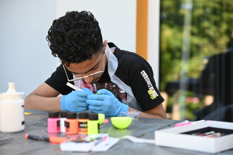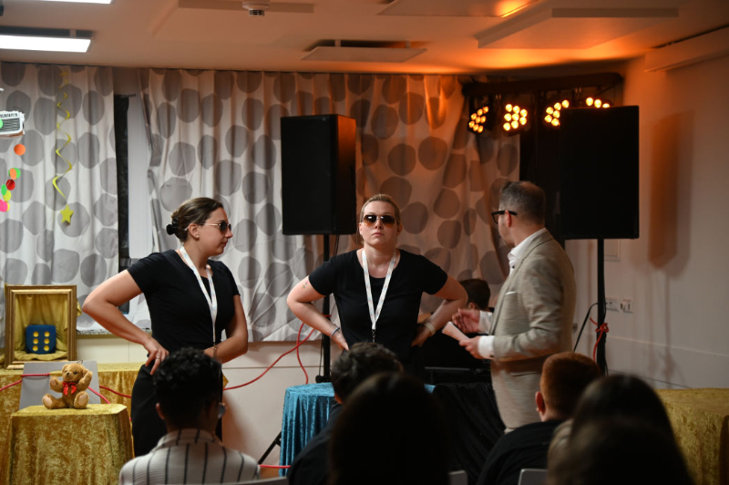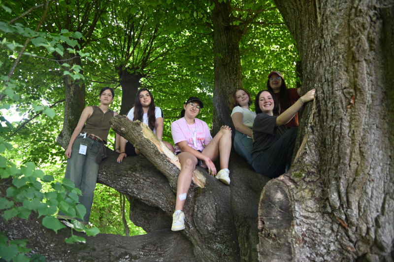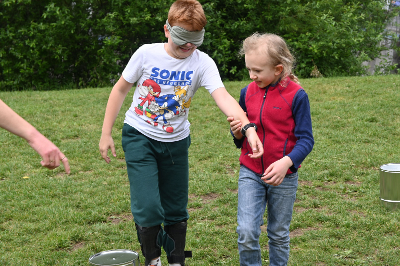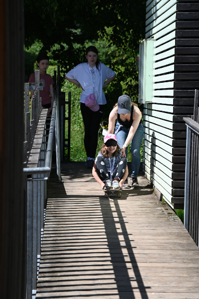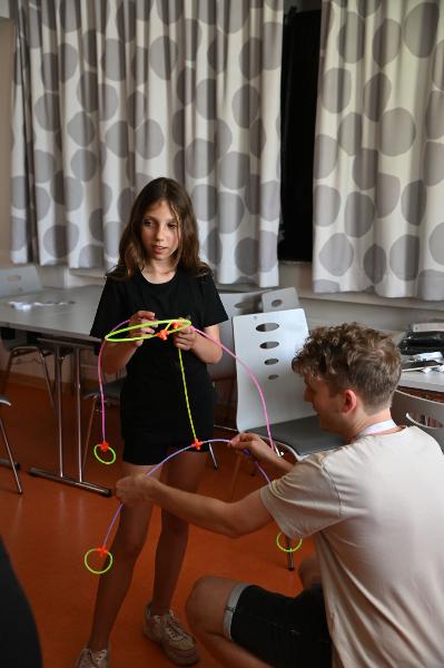 Dort erholten wir uns erstmal und hatten Freizeit. Wer Lust und Laune hatte, konnte sich aber auch an die Tische auf der Terrasse setzen und Morse-Armbänder fädeln und/oder sich bei besonderen Kratzbildern austoben. Highlight war dann definitiv die anschließende Wasserschlacht, die für alle eine wohltuende Abkühlung war und für viel Spaß sorgte. Und dann war es tatsächlich schon wieder so weit: der Abschlussabend stand an. Herausgebrezelte Teilnehmer*innen und Betreuer*innen betraten den Raum – das Spielzeugmuseum mit ihrer Eintrittskarte. Bei diesem halfen wir gemeinsam den zwei Securities Michelle und Sabrina, denen ständig Dinge aus dem Museum gestohlen wurden. Wir lösten die Rätsel, fassten den Dieb Chris und rundeten den Abend mit einer großartigen Party ab.