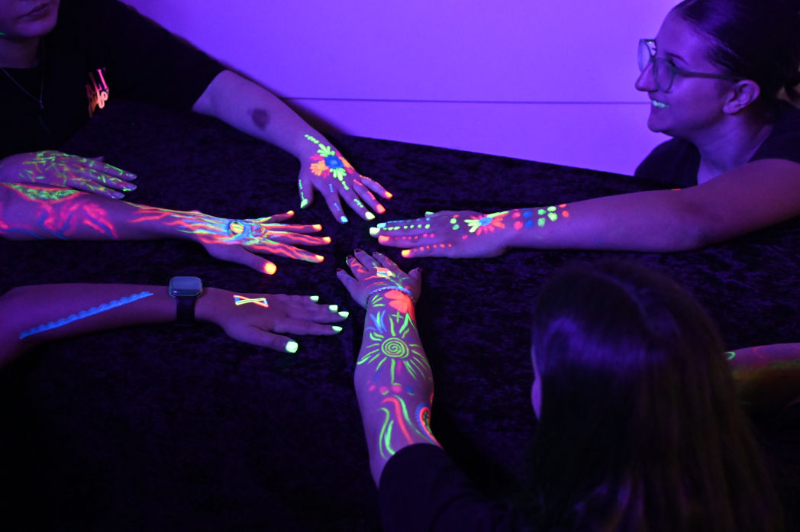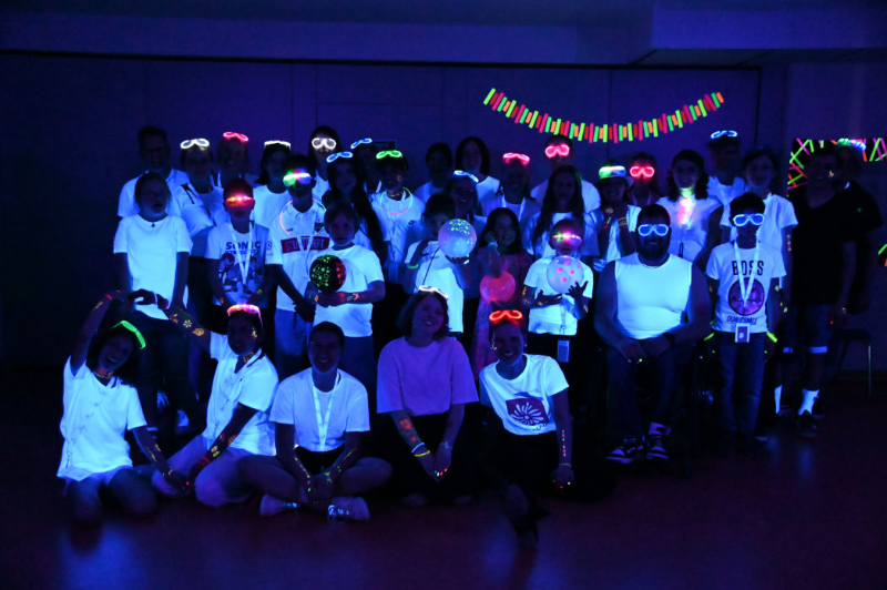 Am Freitag begann der Tag mit „Blind gewinnt“. Wir lernten, wie sich blinde Personen fortbewegen, sich in der Küche orientieren und Fußball und Gesellschaftsspiele spielen. Das Mittagessen folgte dann auf eine besondere Art und Weise. Und zwar gab es ein „Dinner in The Dark“. In den Raum wurden wir mit verdeckten Augen geführt, fanden heraus wer noch mit uns am Tisch saß, und aßen die Vor- und Hauptspeise, sowie das Dessert, ohne vorher zu wissen, was es ist. Danach stand die Wahl der Arbeitsgemeinschaften (AGs) an. Die Auswahl umfasste kreative Angebote, sowie das Bemalen mit Neonfarben inkl. Schwarzlicht-Fotoshooting, das Basteln von Windlichtern, die Produktion von Strichmännchen-Videos und das Gestalten von Lichterketten. Jede AG bot den Teilnehmer*innen die Möglichkeit, sich auf unterschiedliche Weise künstlerisch zu entfalten und trug so zu abwechslungsreichen und unterhaltsamen Stunden bei. Danach stand die Vorbereitung auf die Schwarzlichtdisco an. Jede und jeder nutzte die freie Zeit, um sich mit Neontattoos und Nagellack zu schmücken. Die Disco selbst war ein farbenprächtiges Spektakel, bei dem die leuchtenden Farben und die bunt lackierten Nägel im Dunkeln besonders zur Geltung kamen. Klassiker wie “Das rote Pferd” und “Cotton Eye Joe” sorgten für ausgelassene Stimmung und brachten die Tanzfläche zum Beben. Darauf folgte das traditionelle Candlelight, das schön, traurig, wohltuend und berührend zu gleich