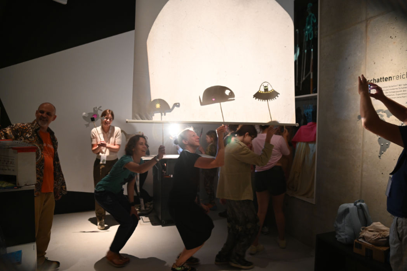 man Transparentpapier hielt, konnte man Silhouetten auf das Papier abzeichnen. Wir erfuhren, dass Schattenspiel die wohl älteste Form der Unterhaltung ist. Außerdem, dass Schatten nicht nur schwarz, sondern auch kunterbunt sein können, je nachdem aus welchem Material die Figur gemacht ist. Neben dem Museum gab es einen Gewölbekeller, indem mehrere kleine “Tische” standen, die durch LEDs in verschiedenen Farben leuchten und mit einer dünnen